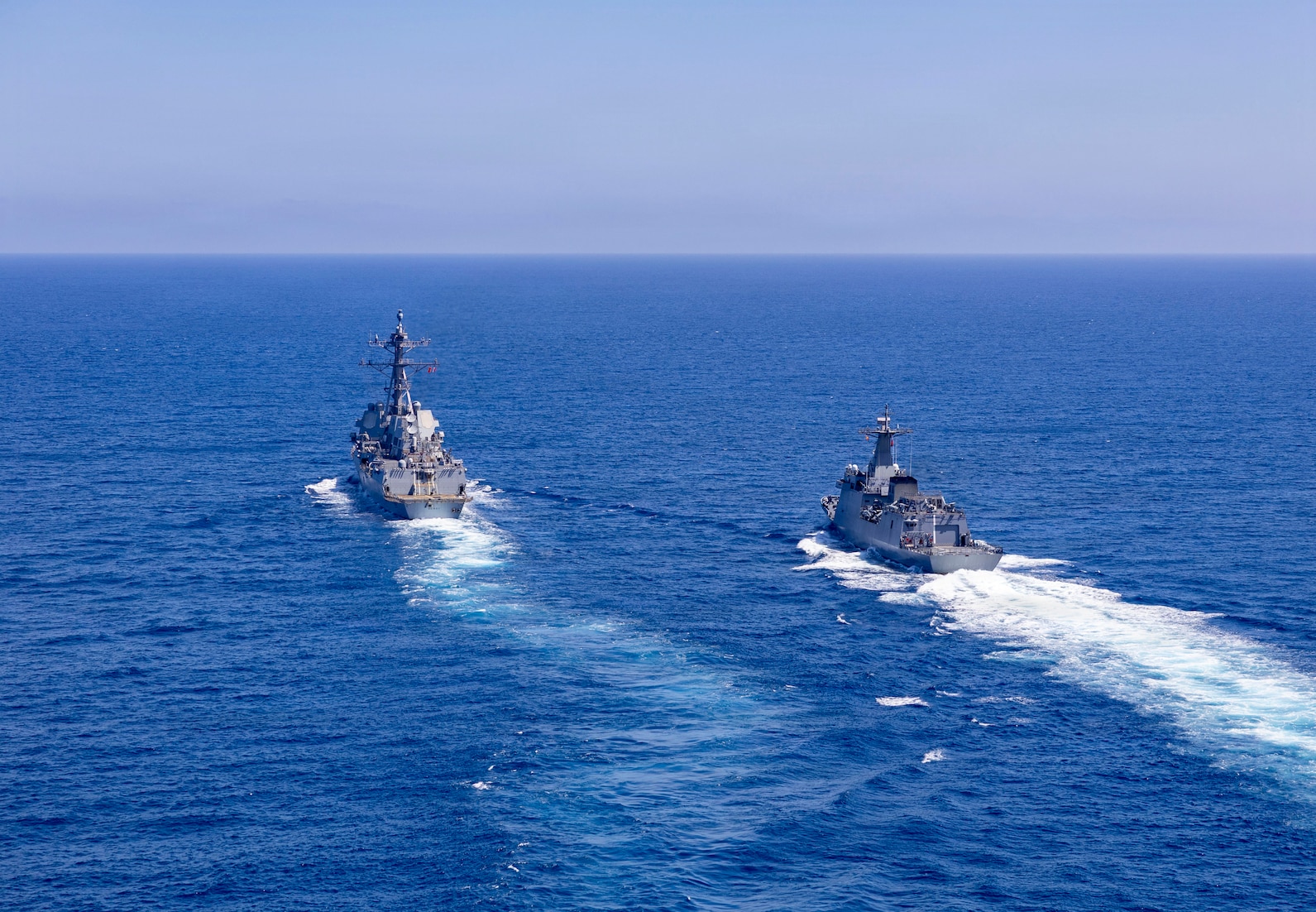Philippine Navy Jose Rizal-class guided-missile frigate BRP Antonio Luna (FF 151), right, steams alongside U.S. Navy Arleigh Burke-class missile-guided destroyer USS Dewey (DDG 105) while conducting a replenishment-at-sea exercise in the Philippine Sea during the multilateral Maritime Cooperative Activity (MCA) alongside Japan and the Philippines in the Philippine Exclusive Economic Zone, Feb. 25, 2026. The U.S. Navy routinely operates with the Armed Forces of the Philippines and partners and allies through MCAs to continually develop, exercise and enhance multi-domain tactical interoperability to uphold peace and security in the region. Dewey is forward-deployed and assigned to Destroyer Squadron (DESRON) 15, the Navy’s largest DESRON and the U.S. 7th Fleet’s principal surface force. (U.S. Navy photo by Mass Communication Specialist 2nd Class Oscar Diaz)