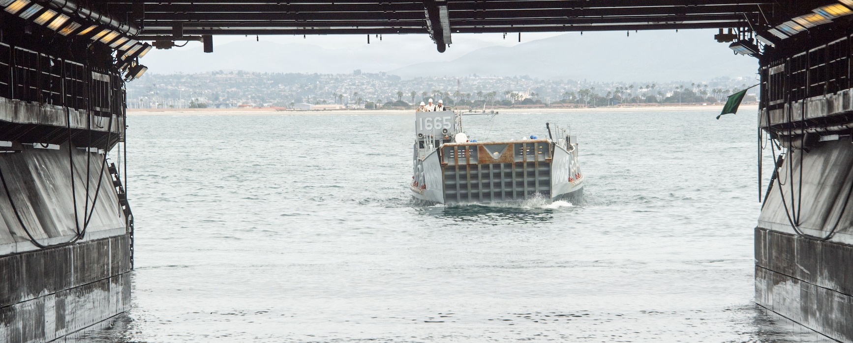 Landing craft utility 1665, attached to Assault Craft Unit (ACU) 1, starts its approach to Wasp-class amphibious assault ship USS Essex (LHD 2) in preparation for well deck operations, Feb. 15, 2026. Essex is currently underway conducting routine operations. (U.S. Navy photo by Mass Communication Specialist Seaman Aaron J. Rolle)