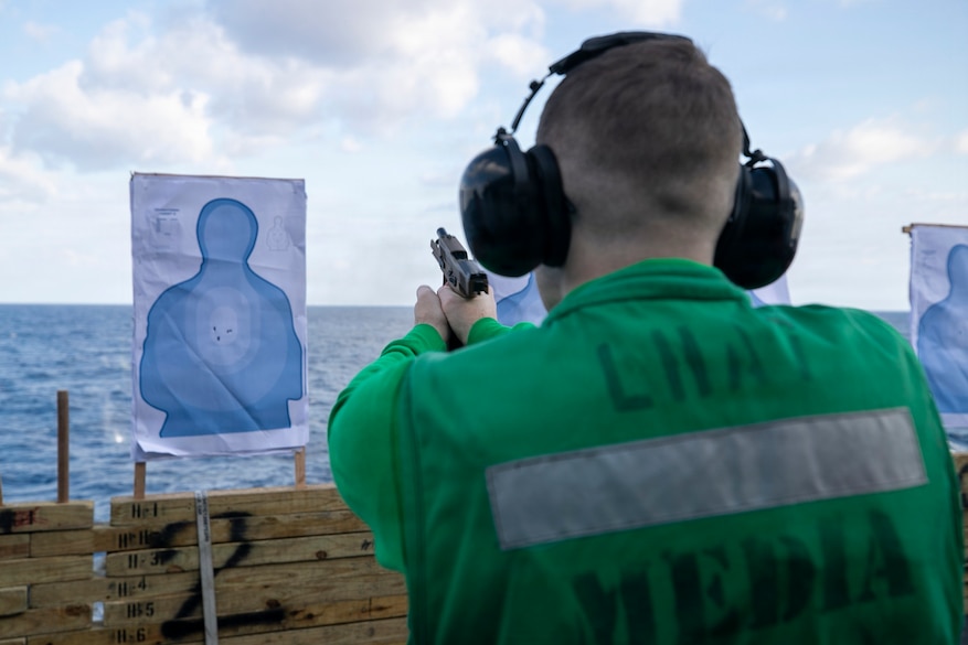 Mass Communication Specialist Seaman Apprentice Reese Taylor fires an M18 pistol during a live-fire exercise aboard America-class amphibious assault ship USS Tripoli (LHA 7), Mar. 12, 2026. U.S. 7th Fleet, the U.S. Navy’s largest forward-deployed numbered fleet, routinely interacts and operates with allies and partners in preserving a free and open Indo-Pacific. (U.S. Navy photo by Mass Communication Specialist 3rd Class Colten Bradley)