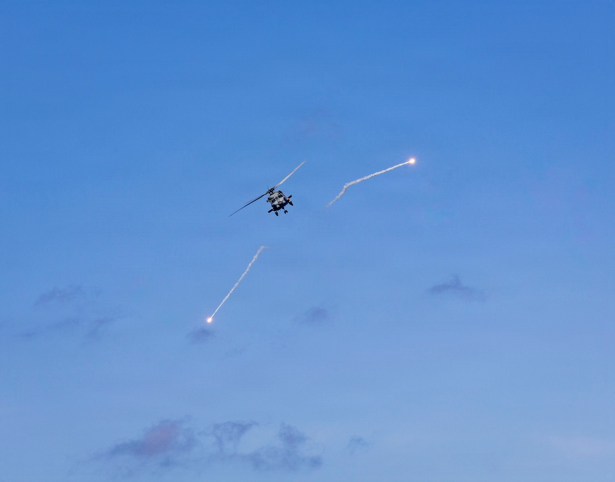 A U.S. Navy MH-60R Sea Hawk helicopter, assigned to Helicopter Maritime Strike Squadron (HSM) 51, fires off flares alongside Arleigh Burke-class guided-missile destroyer USS Dewey (DDG 105) during a surface-to-air countermeasure exercise while underway in the North Pacific Ocean, March 8, 2026. Dewey is forward deployed and assigned to Destroyer Squadron (DESRON) 15, the Navy’s largest DESRON and the U.S. 7th Fleet’s principal surface force. (U.S. Navy photo by Mass Communication Specialist 2nd Class Oscar Diaz)
