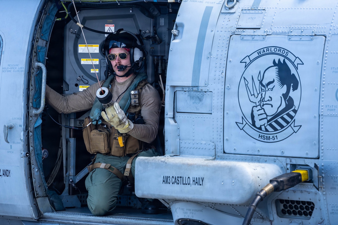 U.S. Navy Naval Air Crewman (Helicopter) 2nd Class Justin Baker, from Illinois, assigned to Helicopter Maritime Strike Squadron (HSM) 51, inspects the rescue hook of an MH-60R Sea Hawk helicopter on the flight deck of Arleigh Burke-class guided-missile destroyer USS Rafael Peralta (DDG 115) in the Philippine Sea, March 11, 2026. Rafael Peralta is forward deployed and assigned to Destroyer Squadron (DESRON) 15, the Navy's largest DESRON and the U.S. 7th Fleet's principal surface force. (U.S. Navy photo by Mass Communication Specialist 1st Class Ryre Arciaga)