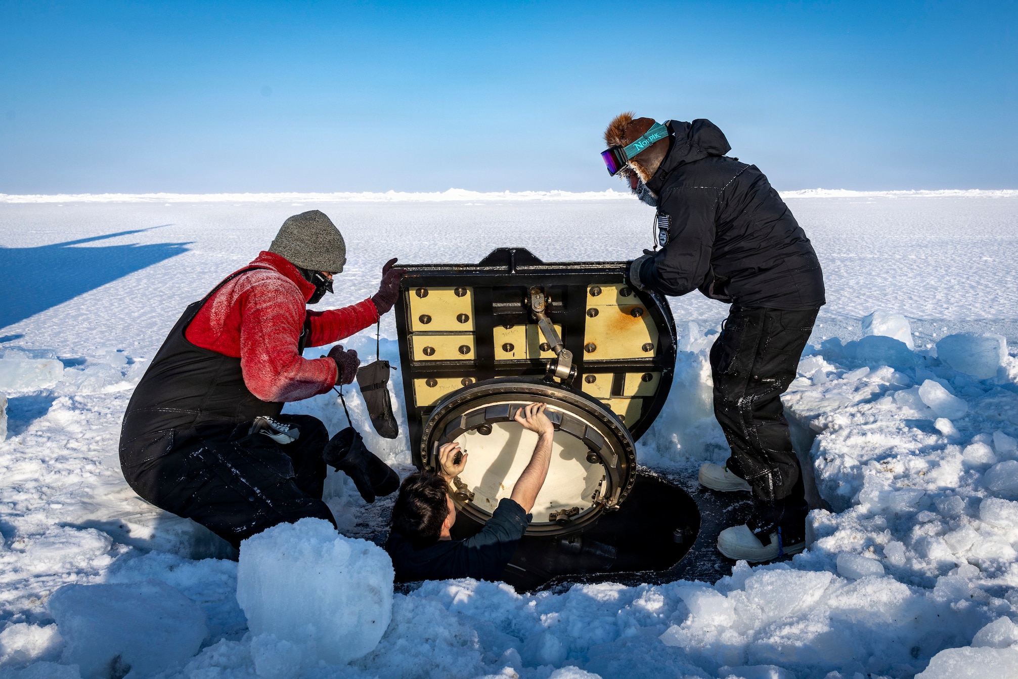 BEAUFORT SEA, Arctic Circle - Mike Demello from Arctic Submarine Laboratory, right, and Aaron Clarke from Naval Undersea Warfare Center remove lift a hatch on Los Angeles-class fast-attack submarine USS Santa Fe (SSN 763) during Operation ICE CAMP 2026 Mar. 15. ICE CAMP Boarfish is a three-week operation designed to research, test, and evaluate operational capabilities in the Arctic region. In addition to U.S. Navy, U.S. Marine Corps, and Air National Guard participation, personnel from the Royal Australian Navy, Royal Canadian Navy, Royal Canadian Air Force, French Navy, Royal United Kingdom Navy, Norwegian Defence Research Institute, and the Japan Agency for Marine-Earth Science and Technology are also taking part. This operation, held biennially, partners with the ASL and was elevated from an exercise to an operation to better reflect the Navy’s strategic priorities in the Arctic. ICE CAMP provides the necessary training to maintain a working knowledge of a constantly changing region. (U.S. Navy Photo by Mass Communication Specialist 1st Class Jacob D. Bergh