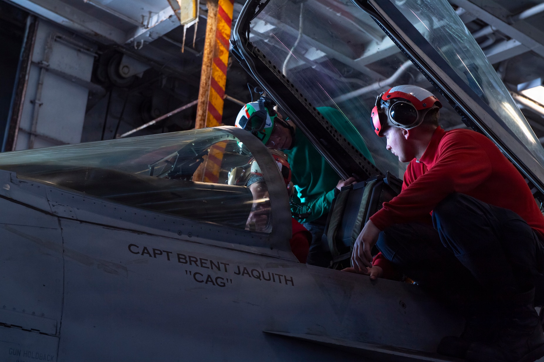 U.S. Sailors conduct maintenance on the cockpit of an F/A-18E Super Hornet, attached to Strike Fighter Squadron (VFA) 137, on the hangar bay of Nimitz-class aircraft carrier USS Nimitz (CVN 68) in the Pacific Ocean, March 17, 2026. Nimitz is underway in the U.S. 3rd Fleet area of operations as part of a scheduled homeport shift to Norfolk, Virginia. (U.S. Navy Photo by Mass Communication Specialist Seaman Tanner Orth)