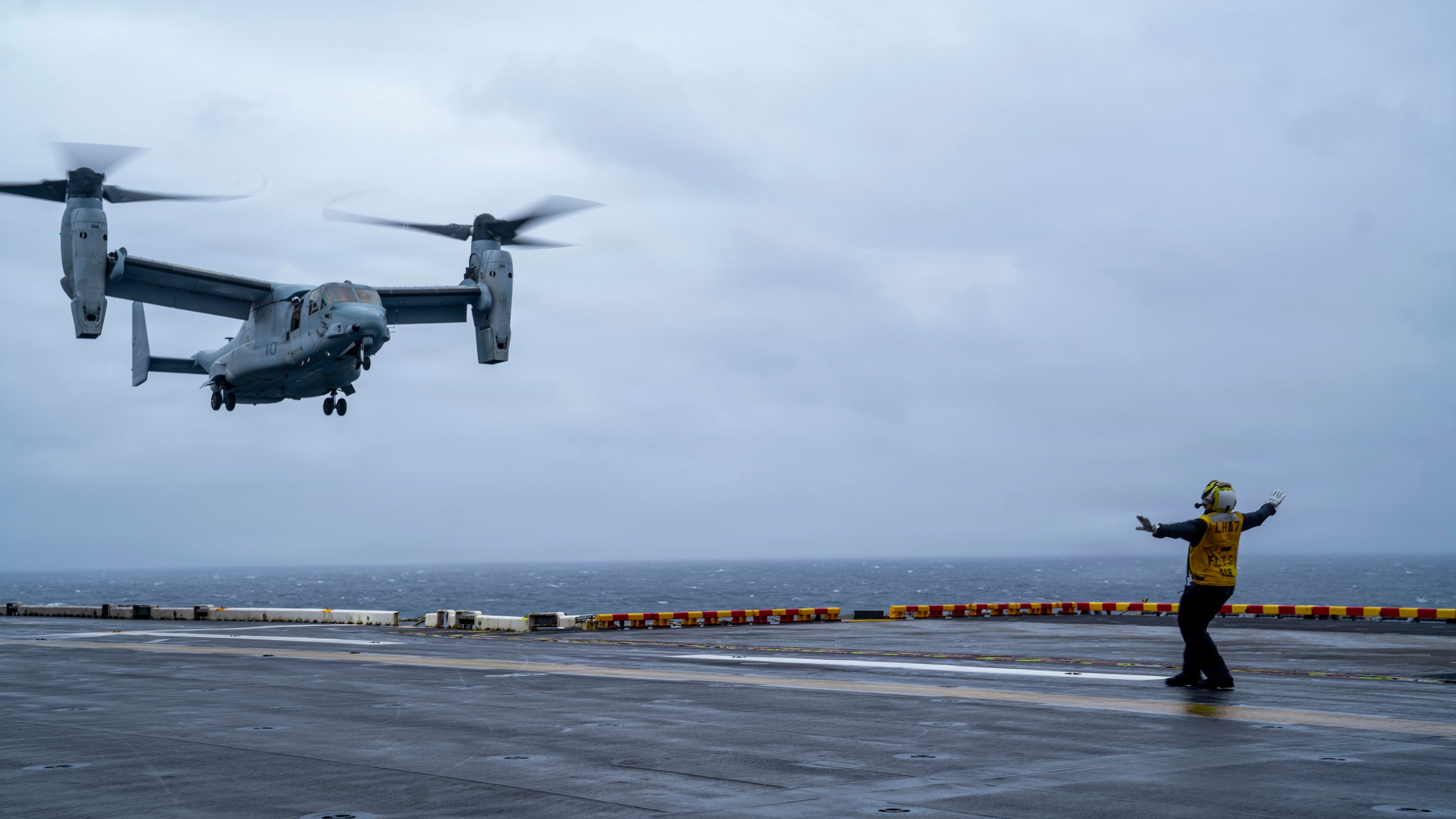 Aviation Boatswain’s Mate (Aircraft Handling) 2nd Class Zaira Marez directs the landing of an MV-22 Osprey, attached to Marine Medium Tiltrotor Squadron (VMM) 265, on the flight deck of America-class amphibious assault ship USS Tripoli (LHA 7), during flight quarters, March 2, 2026. Tripoli Amphibious Ready Group (ARG), composed of America-class amphibious assault ship USS Tripoli (LHA 7) and San Antonio-class amphibious transport dock ships USS New Orleans (LPD 18), along with the 31st Marine Expeditionary Unit (MEU), are underway conducting routine operations in the U.S. 7th Fleet area of operations. U.S. 7th Fleet, the U.S. Navy’s largest forward-deployed numbered fleet, routinely interacts and operates with allies and partners in preserving a free and open Indo-Pacific. (U.S. Navy photo by Mass Communication Specialist 3rd Class Angel Conde)