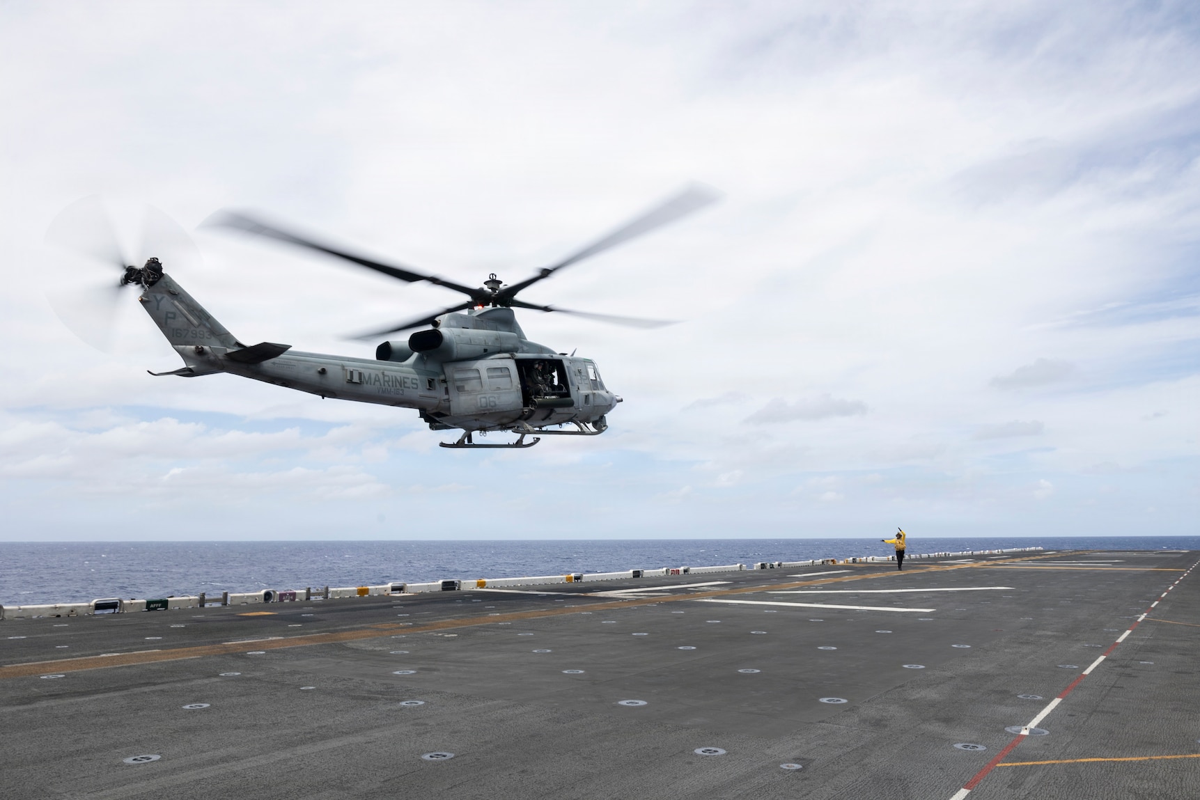 A U.S. Marine Corps UH-1Y Venom, assigned to Marine Medium Tiltrotor Squadron (VMM) 163 (Reinforced), 11th Marine Expeditionary Unit, lands aboard Wasp-class amphibious assault ship USS Boxer (LHD 4) during flight operations in the Pacific Ocean, April 2, 2026. The 11th MEU is currently underway aboard the Boxer Amphibious Ready Group in the U.S. 3rd Fleet area of operations demonstrating the United States’ long-term commitment to a free and open Indo-Pacific. (U.S. Marine Corps photo by Cpl. Oliver Nisbet)