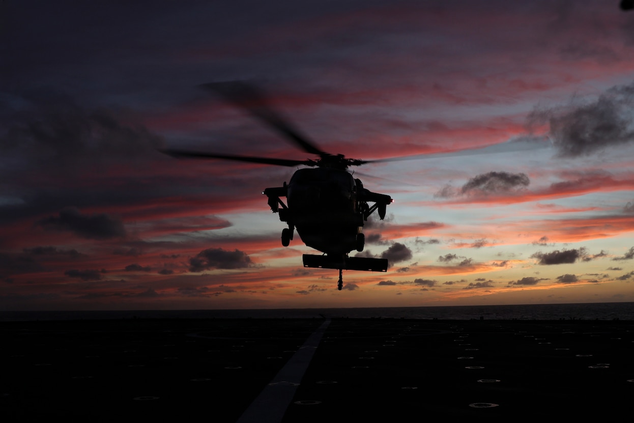 An MH-60S Sea Hawk, attached to Helicopter Sea Combat Squadron (HSC) 21, prepares to land on the flight deck of Whidbey Island-class amphibious dock landing ship USS Comstock (LSD 45), April 2, 2026. Comstock, part of the Boxer Amphibious Ready Group, is underway with the 11th Marine Expeditionary Unit in the U.S. 3rd Fleet area of operations demonstrating the U.S. Navy’s long-term commitment to a free and open Indo-Pacific. (U.S. Navy photo by Mass Communication Specialist 1st Class Nadia James)