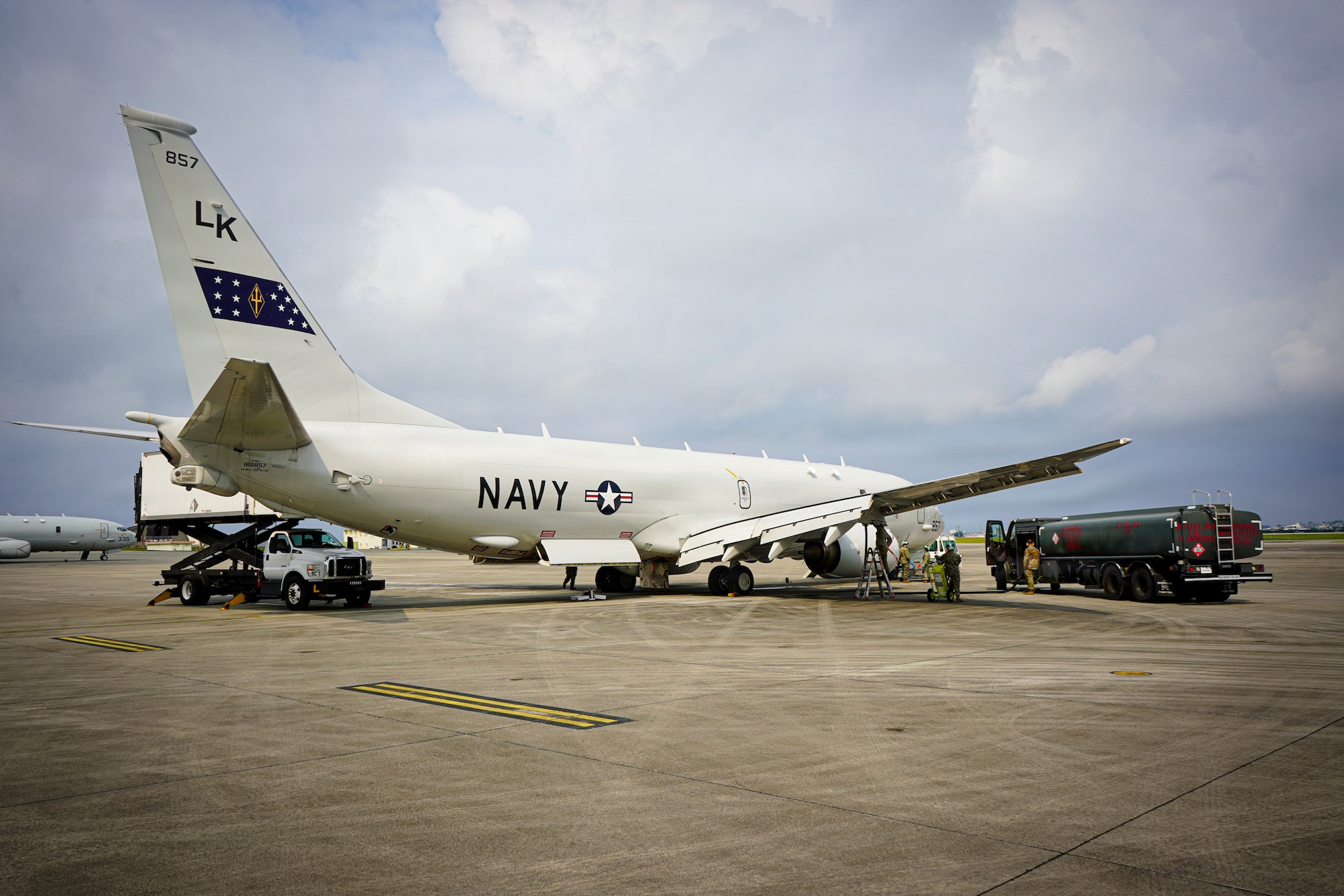 U.S. Navy P-8A Poseidon, assigned to Patrol and Reconnaissance Squadron (VP) 26, receives routine maintenance on Kadena Air Base, Japan, April 12, 2026. VP-26 is forward deployed to the U.S. 7th Fleet area of operations, supporting the Indo-Pacific region. (U.S. Navy Photo by Mass Communication Specialist 2nd Class William Bennett IV)