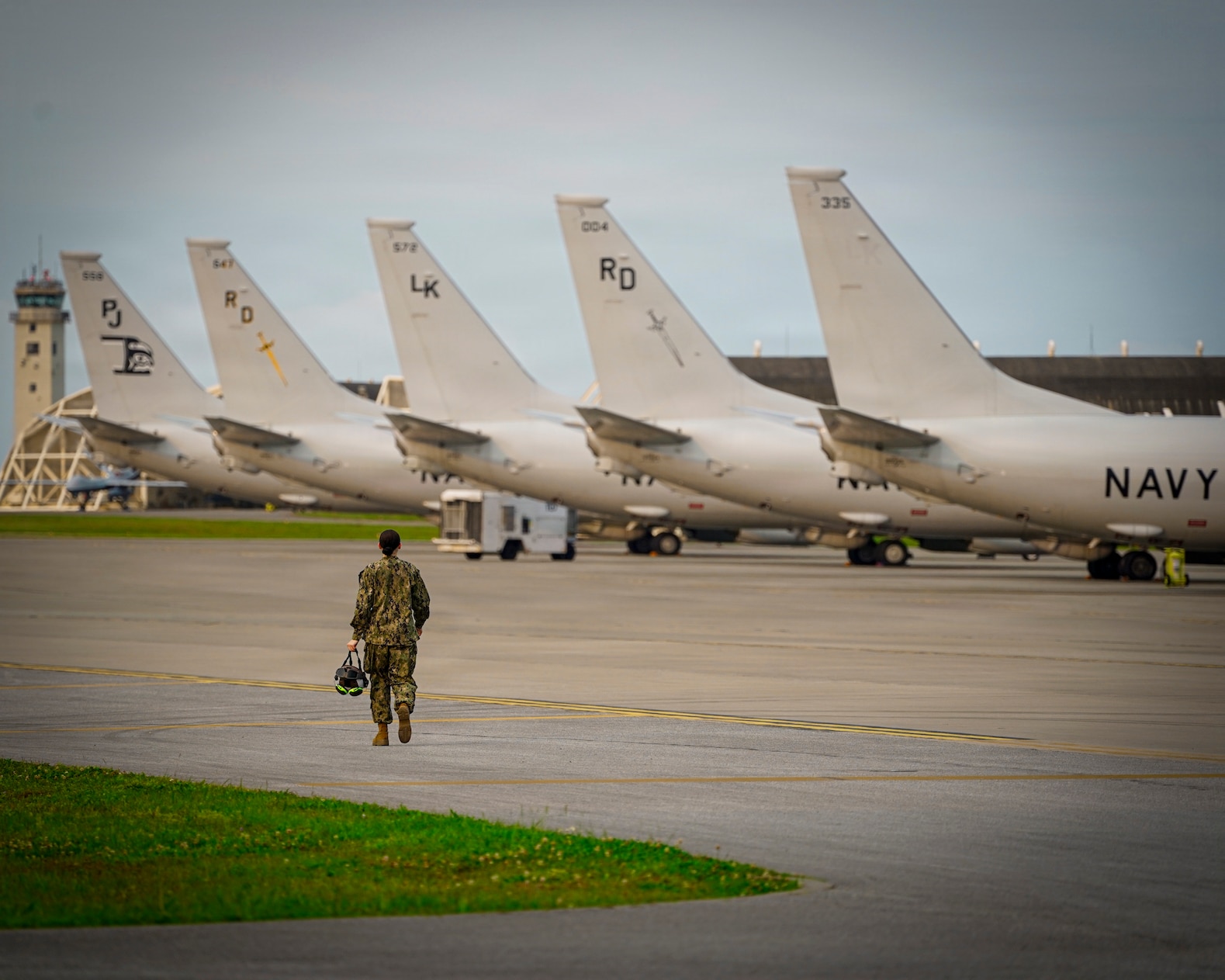 U.S. Navy Aviation Machinist's Mate Airman Jillian McCormick, assigned to Patrol and Reconnaissance (VP) Squadron 26, walks the flightline of P-8A Poseidon's parked on Kadena Air Base, Japan, April 16, 2026. VP-26 is forward deployed to U.S. 7th Fleet, the Navy’s largest forward-deployed numbered fleet. U.S. 7th Fleet routinely interacts and operates with allies and partners in preserving a free and open Indo-Pacific. (U.S. Navy Photo by Mass Communication Specialist 2nd Class William Bennett IV)