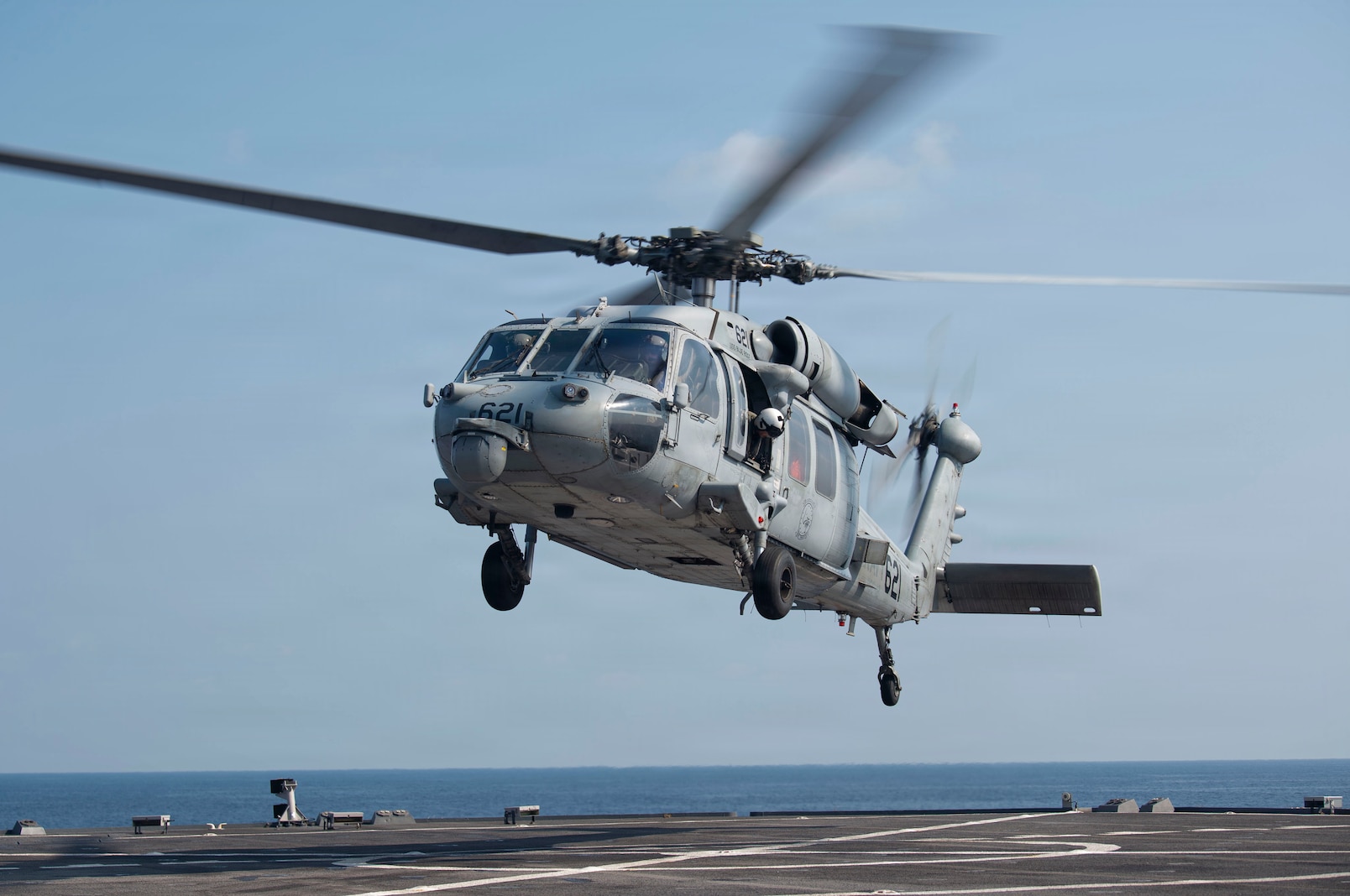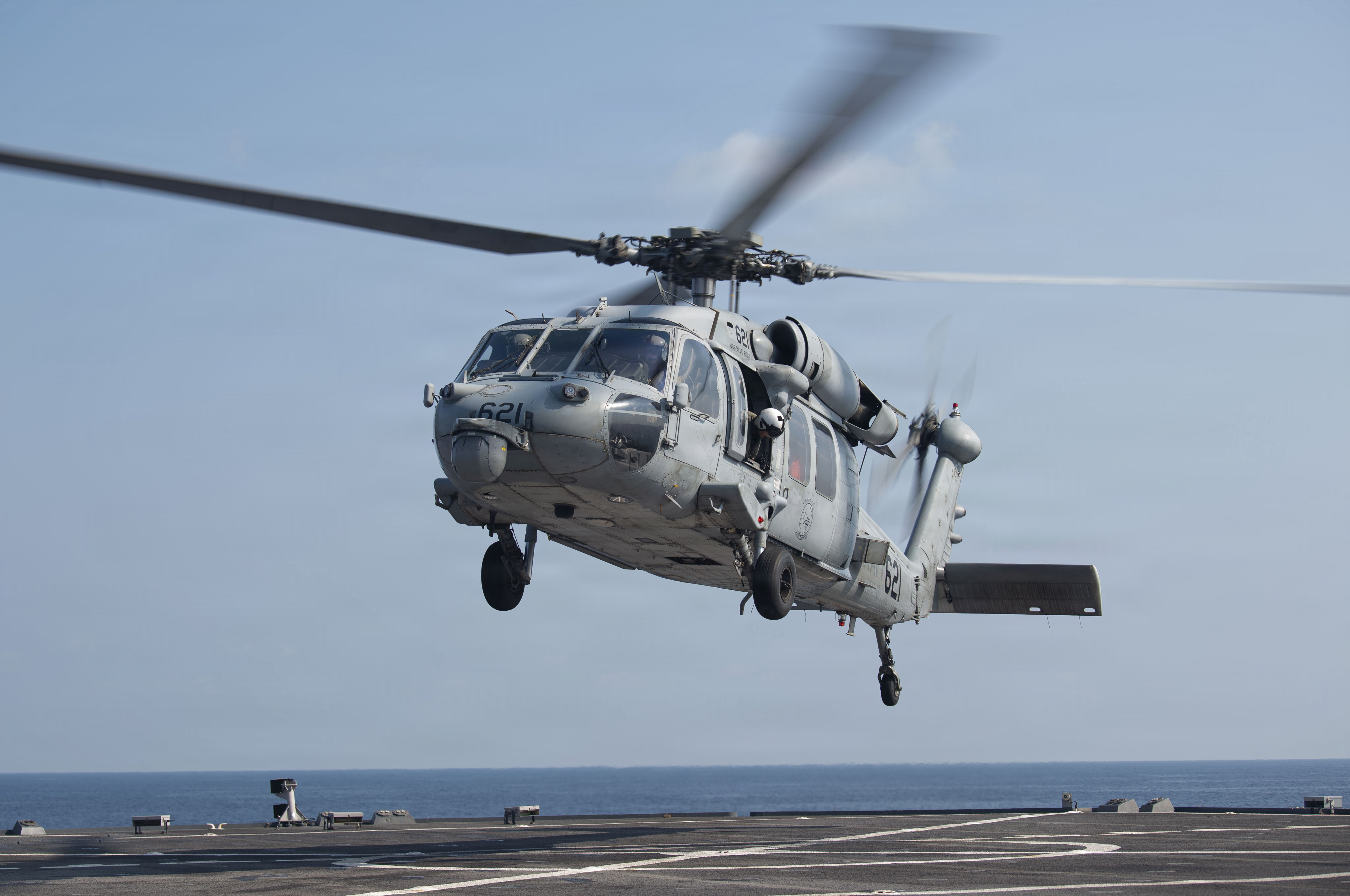 An MH-60S Sea Hawk helicopter, attached to Helicopter Sea Combat Squadron (HSC) 12, prepares to land aboard U.S. 7th Fleet flagship USS Blue Ridge (LCC 19) while underway in the Gulf of Thailand, March 25, 2026. Blue Ridge and embarked U.S. 7th Fleet staff conduct regular Indo-Pacific patrols to deter aggression, strengthen alliances and partnerships, and advance future warfighting capabilities. (U.S. Navy photo by Mass Communication Specialist Seaman Zachary Del Rio)
