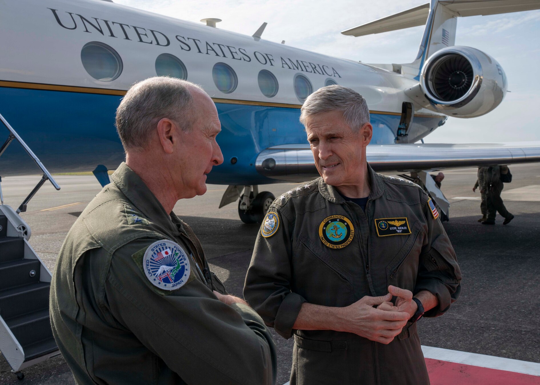 Adm. Steve Koehler, commander, U.S. Pacific Fleet, right, receives an overview of operations from Lt. Gen. Stephen Jost, commander, U.S. Forces Japan, at Yokota Air Base, Japan, April 13, 2026. The visit to Japan underscored the United States’ commitment to peace and stability in the region, committed to enhancing resiliency and interoperability between U.S. and Japanese forces, and other regional allies and partners. (U.S. Navy photo by Mass Communication Specialist 2nd Class Christopher Sypert)