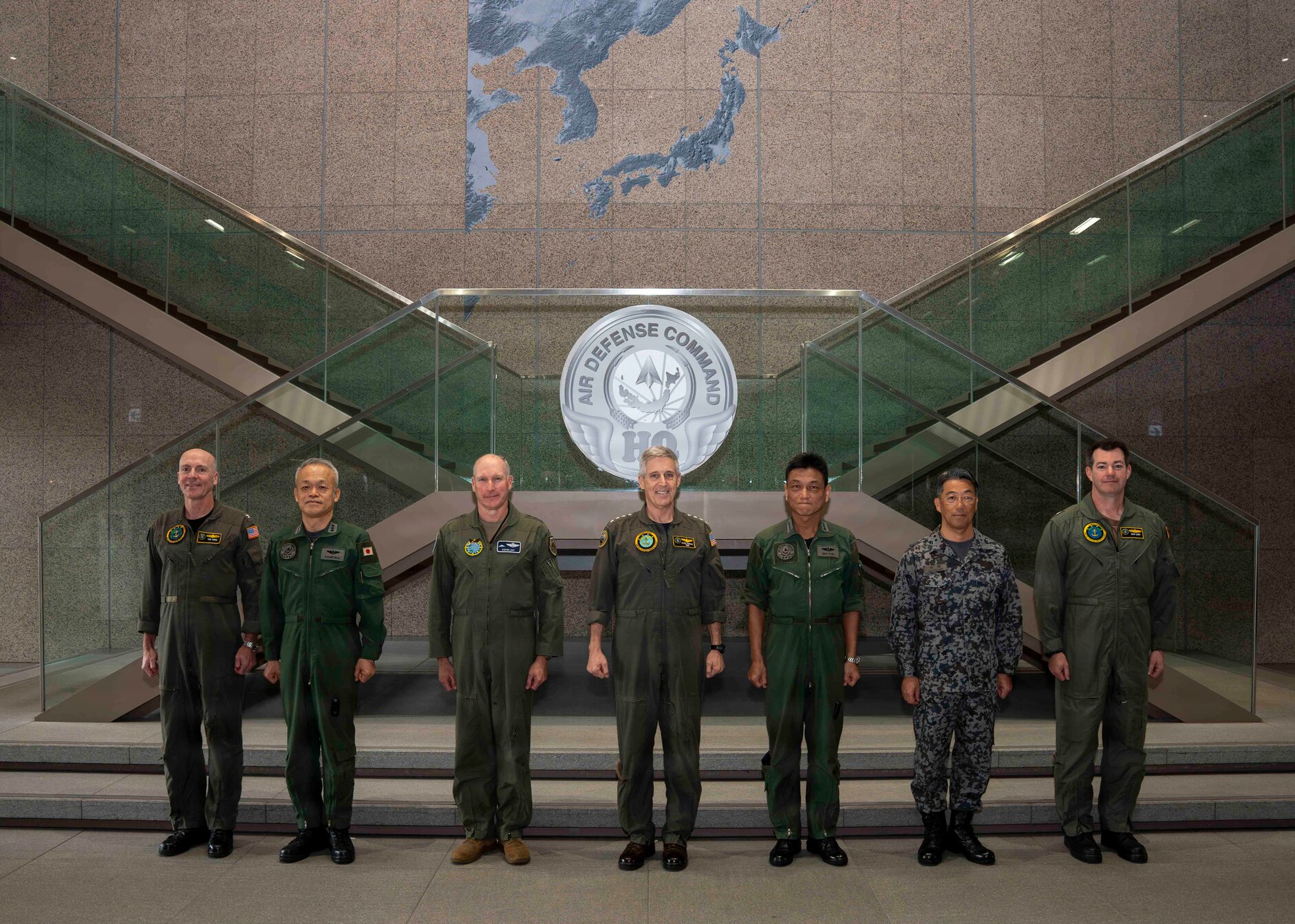 Adm. Steve Koehler, commander, U.S. Pacific Fleet, center, Lt. Gen. Stephen Jost, commander, U.S. Forces Japan, center right, and Lt. Gen. Hidetada Inatsuki, commander, Air Defence Command (ADC), Japan Air Self-Defence Force, center right, and members of their respective staffs pose for a photo at the ADC headquarters on Yokota Air Base, Japan, April 13, 2026. The visit to Japan underscored the United States’ commitment to peace and stability in the region, committed to enhancing resiliency and interoperability between U.S. and Japanese forces, and other regional allies and partners. (U.S. Navy photo by Mass Communication Specialist 2nd Class Christopher Sypert)