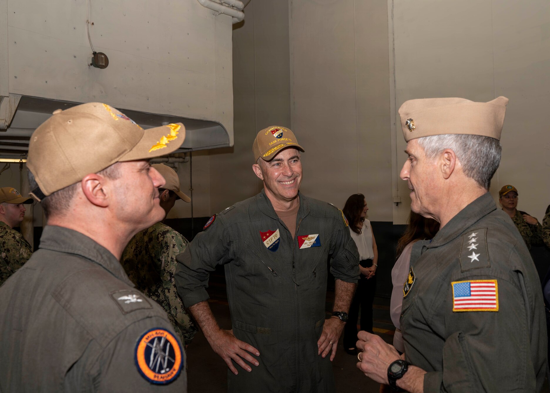 Adm. Steve Koehler, commander, U.S. Pacific Fleet, right, is greeted by Rear Adm. Eric Anduze, commander, Carrier Strike Group 5 and commander, Task Force 70, center, and Capt. Nicholas DeLeo, commanding officer, USS George Washington (CVN 73), during his arrival to Nimitz-class aircraft carrier USS George Washington (CVN 73) while the ship is moored on Commander, Fleet Activities Yokosuka, Japan, April 13, 2026. The visit to Japan underscored the United States’ commitment to peace and stability in the region, committed to enhancing resiliency and interoperability between U.S. and Japanese forces, and other regional allies and partners. (U.S. Navy photo by Mass Communication Specialist 2nd Class Christopher Sypert)