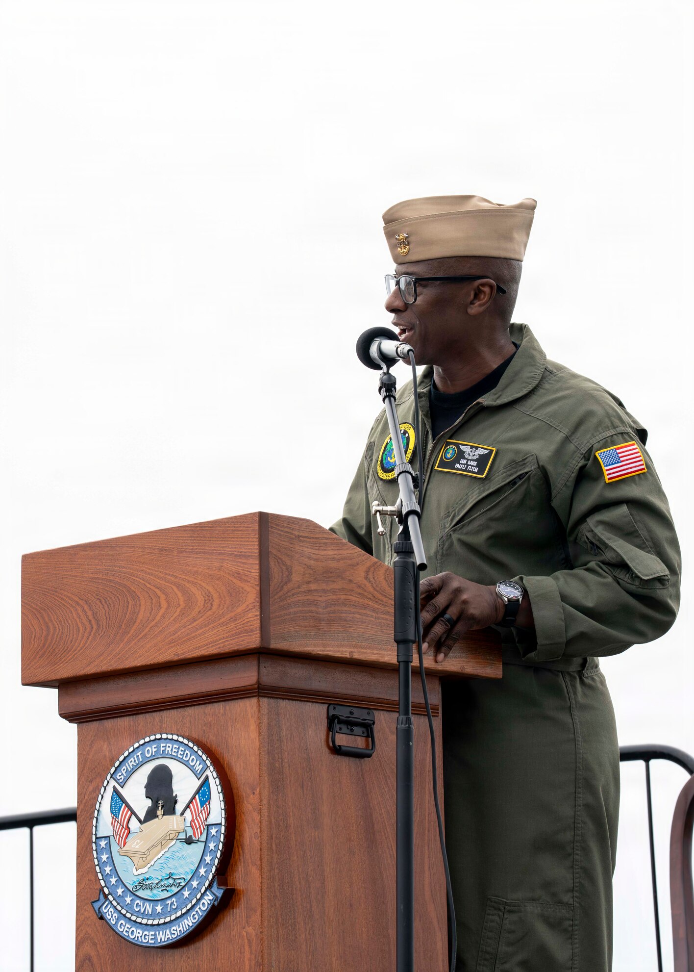 U.S. Pacific Fleet Master Chief Don Davis speaks about the importance of professionalism during an all-hands call on the flight deck of Nimitz-class aircraft carrier USS George Washington (CVN 73) while the ship is moored on Commander, Fleet Activities Yokosuka, Japan, April 13, 2026. The visit to Japan underscored the United States’ commitment to peace and stability in the region, committed to enhancing resiliency and interoperability between U.S. and Japanese forces, and other regional allies and partners. (U.S. Navy photo by Mass Communication Specialist 2nd Class Christopher Sypert)