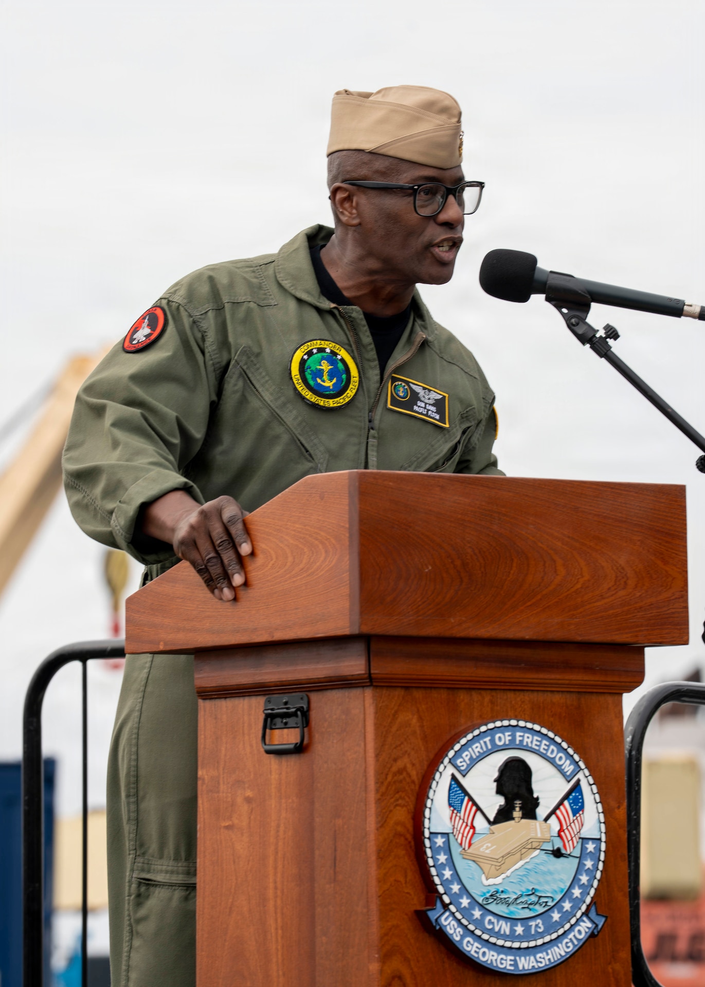U.S. Pacific Fleet Master Chief Don Davis speaks about the importance of professionalism during an all-hands call on the flight deck of Nimitz-class aircraft carrier USS George Washington (CVN 73) while the ship is moored on Commander, Fleet Activities Yokosuka, Japan, April 13, 2026. The visit to Japan underscored the United States’ commitment to peace and stability in the region, committed to enhancing resiliency and interoperability between U.S. and Japanese forces, and other regional allies and partners. (U.S. Navy photo by Mass Communication Specialist 2nd Class Christopher Sypert)