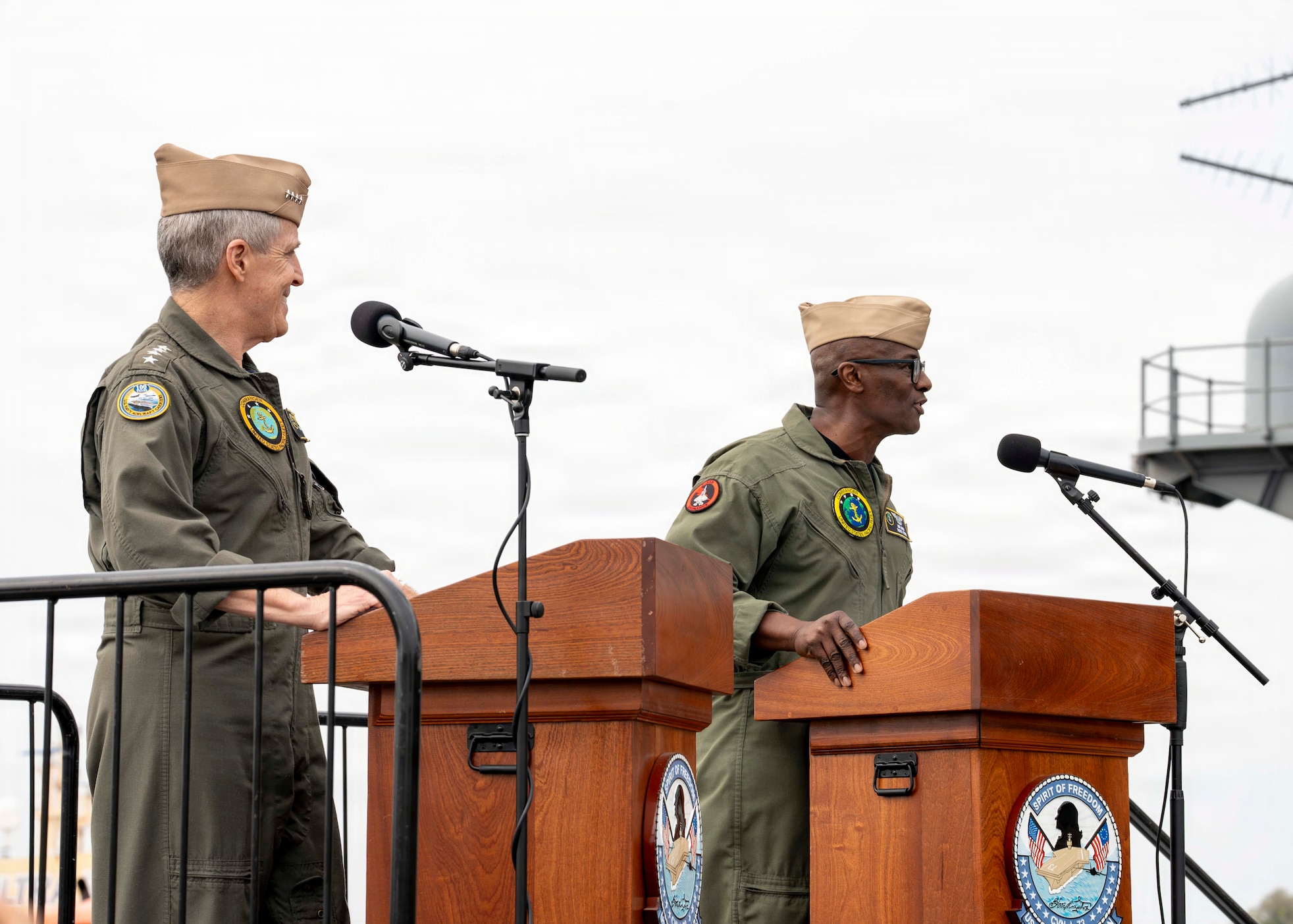 Adm. Steve Koehler, commander, U.S. Pacific Fleet, left, and U.S. Pacific Fleet Master Chief Don Davis speak to Sailors about Koehler’s Fleet Orders during an all-hands call on the flight deck of Nimitz-class aircraft carrier USS George Washington (CVN 73) while the ship is moored on Commander, Fleet Activities Yokosuka, Japan, April 13, 2026. The visit to Japan underscored the United States’ commitment to peace and stability in the region, committed to enhancing resiliency and interoperability between U.S. and Japanese forces, and other regional allies and partners. (U.S. Navy photo by Mass Communication Specialist 2nd Class Christopher Sypert)