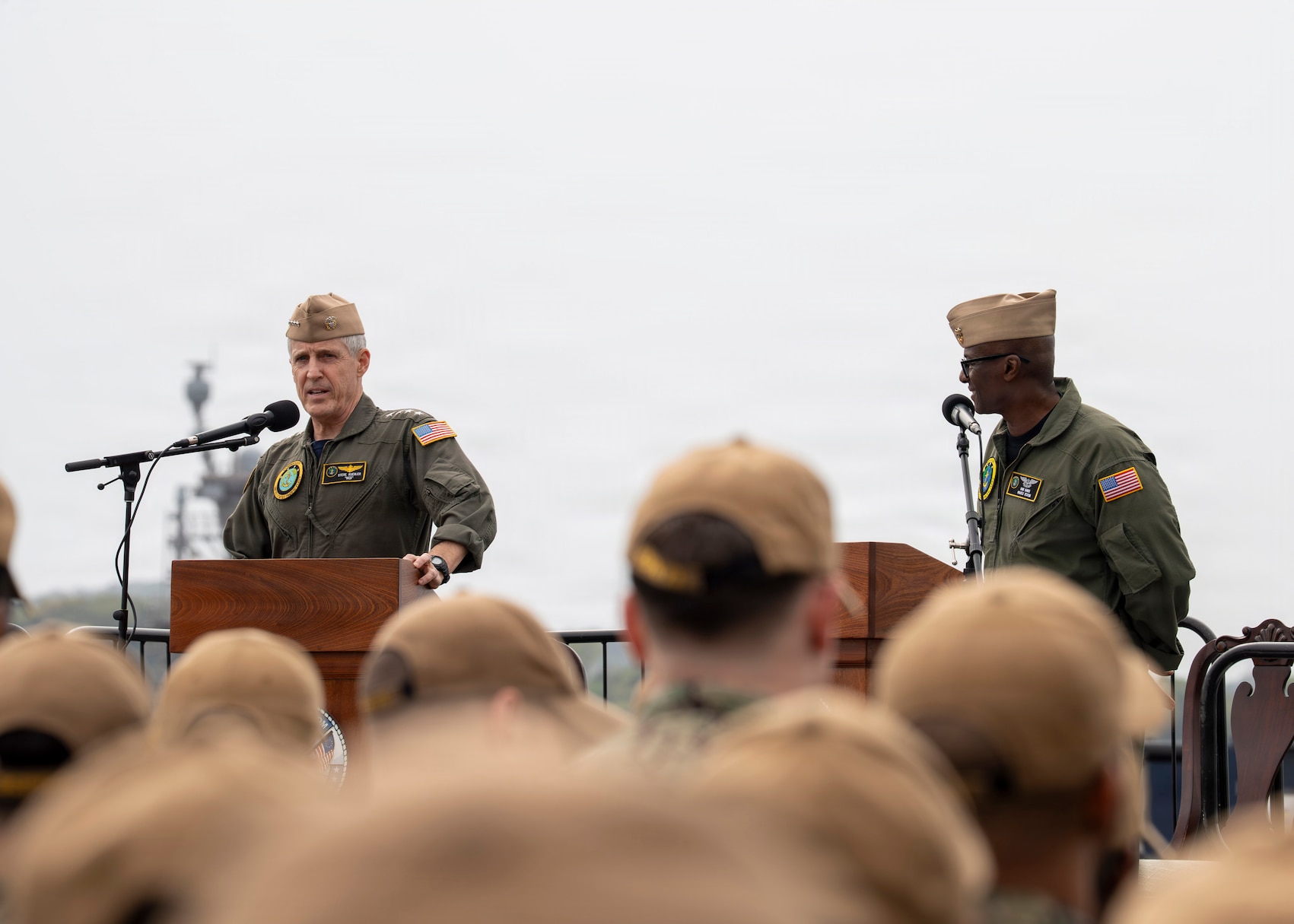 Adm. Steve Koehler, commander, U.S. Pacific Fleet, left, and U.S. Pacific Fleet Master Chief Don Davis speak to Sailors about Koehler’s Fleet Orders during an all-hands call on the flight deck of Nimitz-class aircraft carrier USS George Washington (CVN 73) while the ship is moored on Commander, Fleet Activities Yokosuka, Japan, April 13, 2026. The visit to Japan underscored the United States’ commitment to peace and stability in the region, committed to enhancing resiliency and interoperability between U.S. and Japanese forces, and other regional allies and partners. (U.S. Navy photo by Mass Communication Specialist 2nd Class Christopher Sypert)