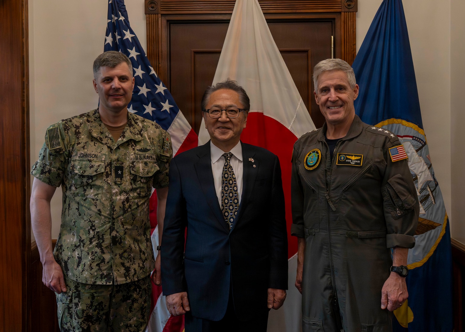 Adm. Steve Koehler, commander, U.S. Pacific Fleet, right, and Rear Adm. Ian Johnson, commander, U.S. Naval Forces Japan (CNFJ), left, meet with the City of Yokosuka Mayor, Katsuaki Kamijii, at the USFJ headquarters on Commander, Fleet Activities Yokosuka, Japan, April 13, 2026. The visit to Japan underscored the United States’ commitment to peace and stability in the region, committed to enhancing resiliency and interoperability between U.S. and Japanese forces, and other regional allies and partners. (U.S. Navy photo by Mass Communication Specialist 2nd Class Christopher Sypert)