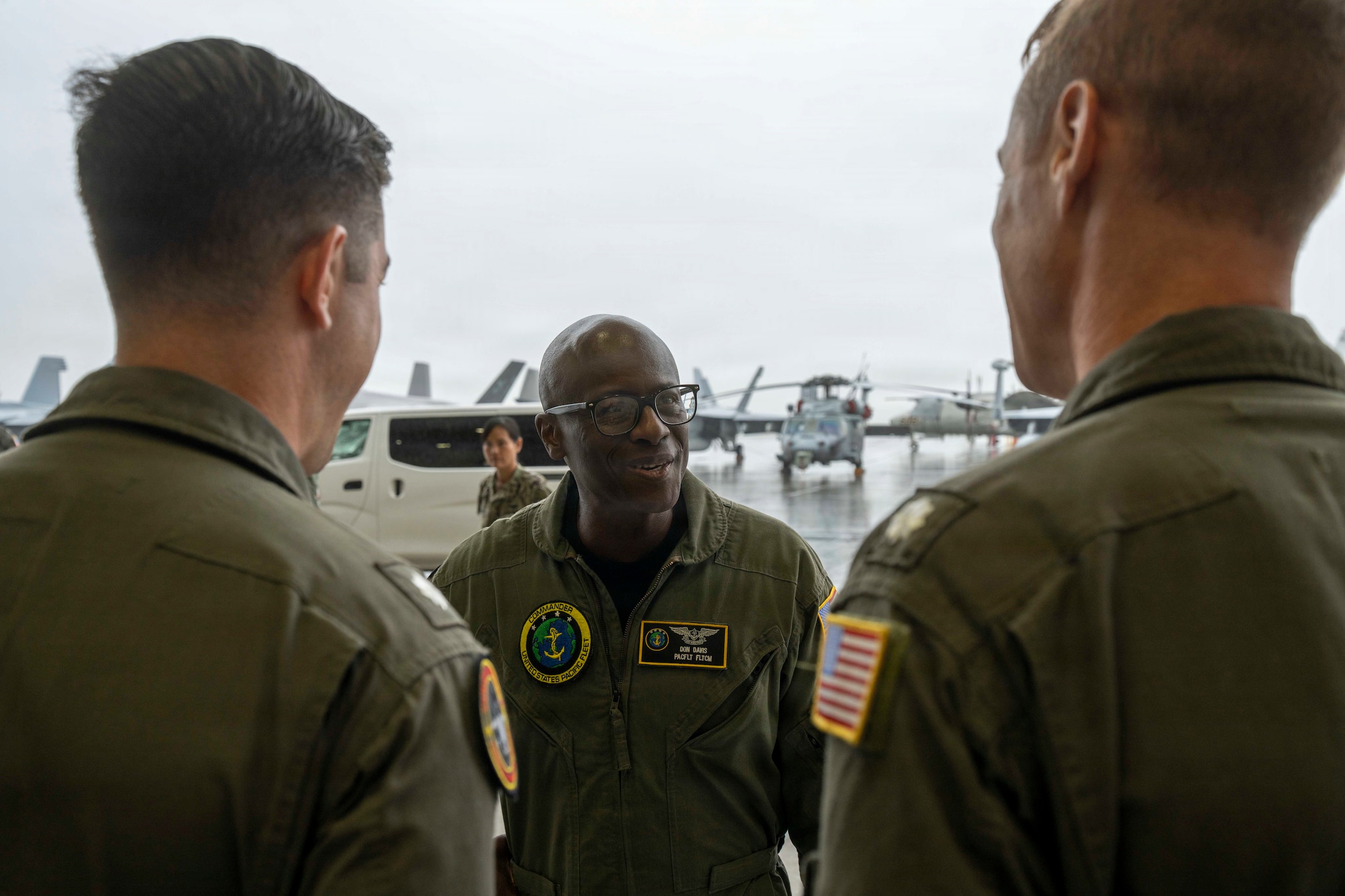 U.S. Pacific Fleet Master Chief Don Davis, center, speaks to Sailors assigned to Carrier Air Wing (CVW) 5 during a tour of Marine Corps Air Station Iwakuni, Japan, April 15, 2026. The visit to Japan underscored the United States’ commitment to peace and stability in the region, committed to enhancing resiliency and interoperability between U.S. and Japanese forces, and other regional allies and partners. (U.S. Navy photo by Mass Communication Specialist 2nd Class Christopher Sypert)