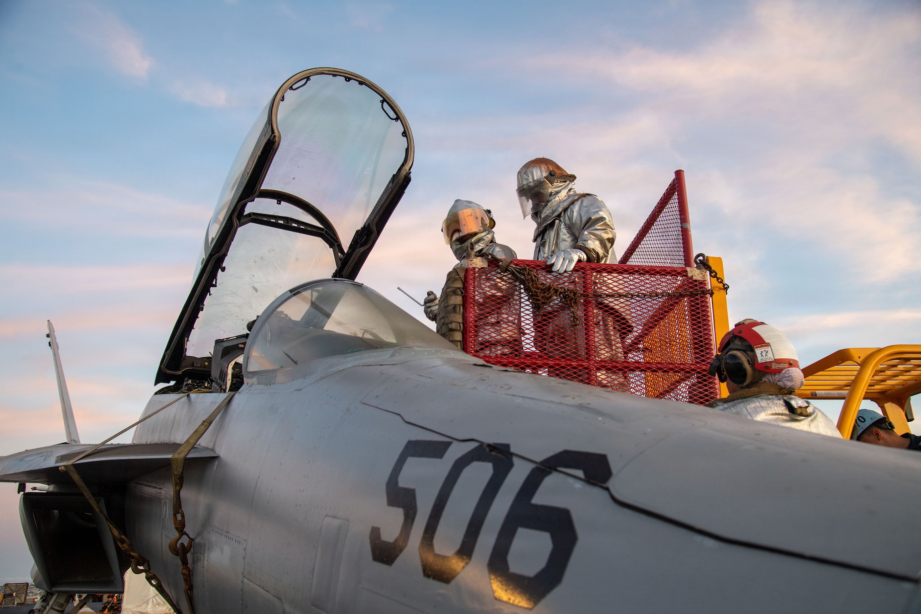 Aviation Boatswain’s Mate (Handling) 3rd Class Winzaevis Marshall, of Georgia, left, and Aviation Boatswain’s Mate (Handling) 3rd Class James Hardaway, of California, participate in an aircraft firefighting drill on the flight deck of Nimitz-class aircraft carrier USS Carl Vinson (CVN 70), April 3, 2026. Carl Vinson is undergoing scheduled maintenance in its homeport of San Diego while remaining a combat-ready force dedicated to protecting and defending the United States. (U.S. Navy photo by Mass Communication Specialist 3rd Class Rocio Zavala-Ramirez)