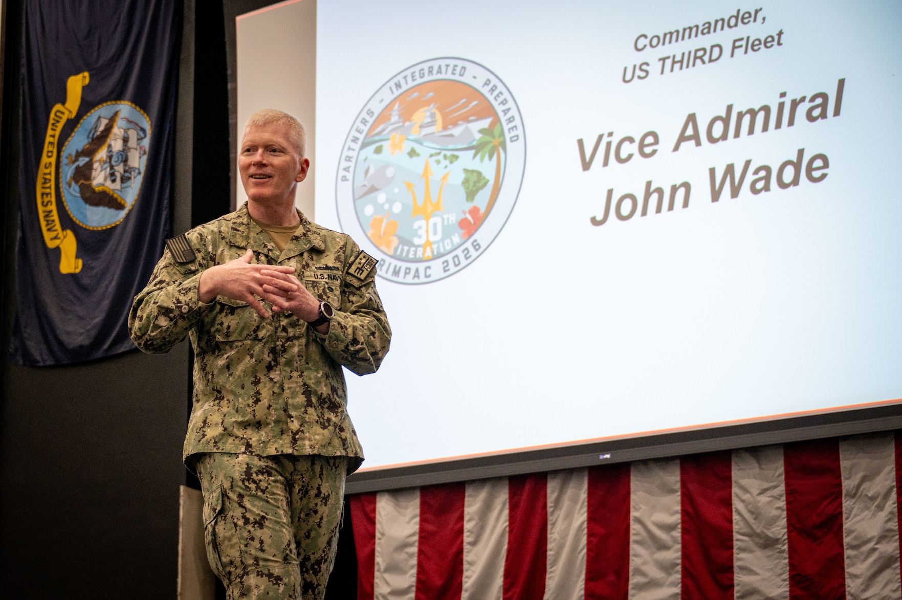 Vice Adm. John Wade, commander, U.S. Third Fleet, gives remarks to members of partner and ally nations at the Exercise Rim of the Pacific (RIMPAC) 2026 Final-Planning Conference at Naval Base Point Loma Annex in San Diegoi, April 14, 2026. RIMPAC is the world's largest international maritime exercise, providing a unique training opportunity that fosters and sustains cooperative relationships among participants. These relationships are critical to ensuring the safety of sea lanes and security on the world's oceans. RIMPAC 2026 marks the 30th iteration of the biennial exercise, which began in 1971. (U.S. Navy photo by Mass Communication Specialist 1st Class Brandon Roberson)