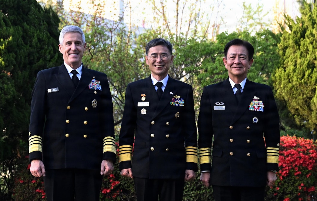 From left to right: Adm. Steve Koehler, commander, U.S. Pacific Fleet, Adm. Kim Kyung-ryul, chief of naval operations, Republic of Korea Navy, and Adm. Akira Saito, chief of staff, Japan Maritime Self-Defense Force (JMSDF), pose for a photo prior to a trilateral dinner in Seoul, April 15, 2026. During the trilateral dinner at the ROKN chief of naval operations' official residence in Seoul, the three admirals discussed ways to collaborate among the ROKN, USN, and JMSDF to deter and enhance interoperability. The U.S., Japan, and ROK are committed to defending vital interests against shared threats by promoting security cooperation, improving information sharing, encouraging peaceful development, responding to contingencies, and deterring aggression. (Photo courtesy of the Republic of Korea Navy)