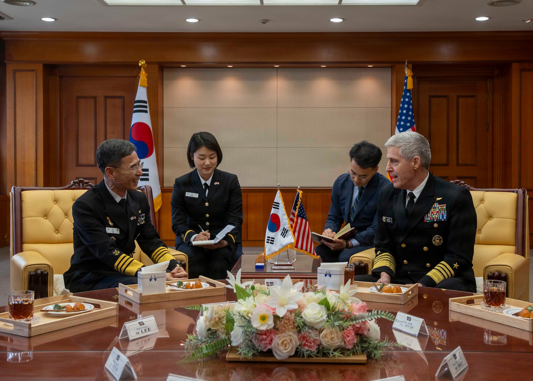 Adm. Steve Koehler, commander, U.S. Pacific Fleet, right, meets with Adm. Kim Kyung-ryul, chief of naval operations, Republic of Korea Navy (ROKN), left, at the ROKN headquarters in Seoul, April 15, 2026. The visit to the Republic of Korea reaffirmed the U.S.- ROK alliance as a linchpin of peace, security, and prosperity, built on decades of shared values, mutual respect, and a commitment to a free and open Indo-Pacific. (U.S. Navy photo by Mass Communication Specialist 2nd Class Christopher Sypert)