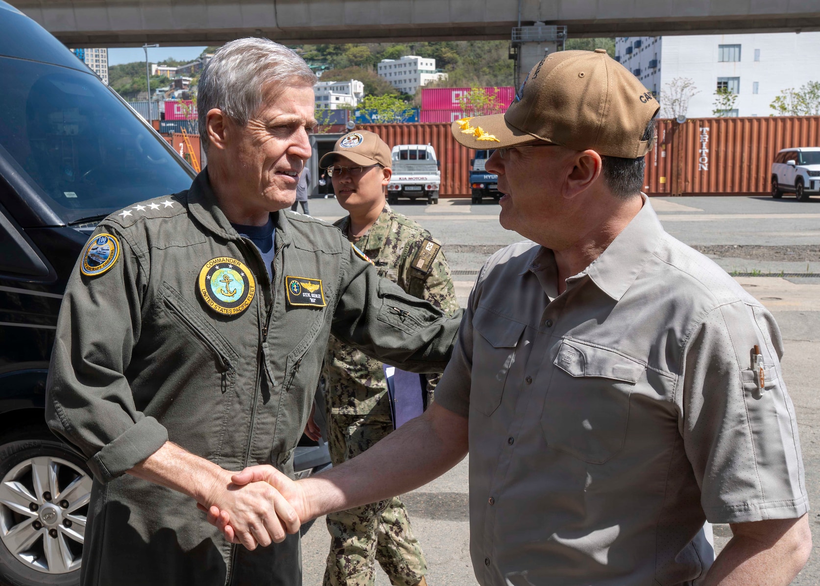 Adm. Steve Koehler, commander, U.S. Pacific Fleet, left, is greeted by Andrew Graff, shipmaster, Lewis and Clark-class dry cargo ship USNS Amelia Earhart (T-AKE 6), prior to a tour of the ship while moored at Yeongdo Shipyard, Busan, Republic of Korea, April 16, 2026. The visit to the Republic of Korea reaffirmed the U.S.- ROK alliance as a linchpin of peace, security, and prosperity, built on decades of shared values, mutual respect, and a commitment to a free and open Indo-Pacific. (U.S. Navy photo by Mass Communication Specialist 2nd Class Christopher Sypert)