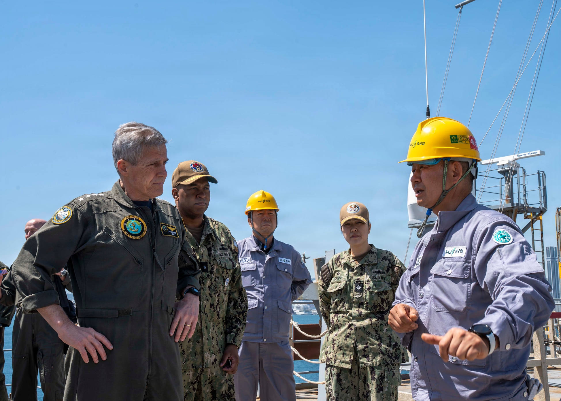 Adm. Steve Koehler, commander, U.S. Pacific Fleet, left, and Rear Adm. Sharif Calfee, commander, U.S. Naval Forces Korea and Navy Region Korea, center left, receive an overview of ship maintenance progress from Min-ho Yoon, part manager, HJ Shipbuilding & Construction, aboard Lewis and Clark-class dry cargo ship USNS Amelia Earhart (T-AKE 6), while moored at Yeongdo Shipyard Busan, Republic of Korea, April 16, 2026. The visit to the Republic of Korea reaffirmed the U.S.- ROK alliance as a linchpin of peace, security, and prosperity, built on decades of shared values, mutual respect, and a commitment to a free and open Indo-Pacific. (U.S. Navy photo by Mass Communication Specialist 2nd Class Christopher Sypert)