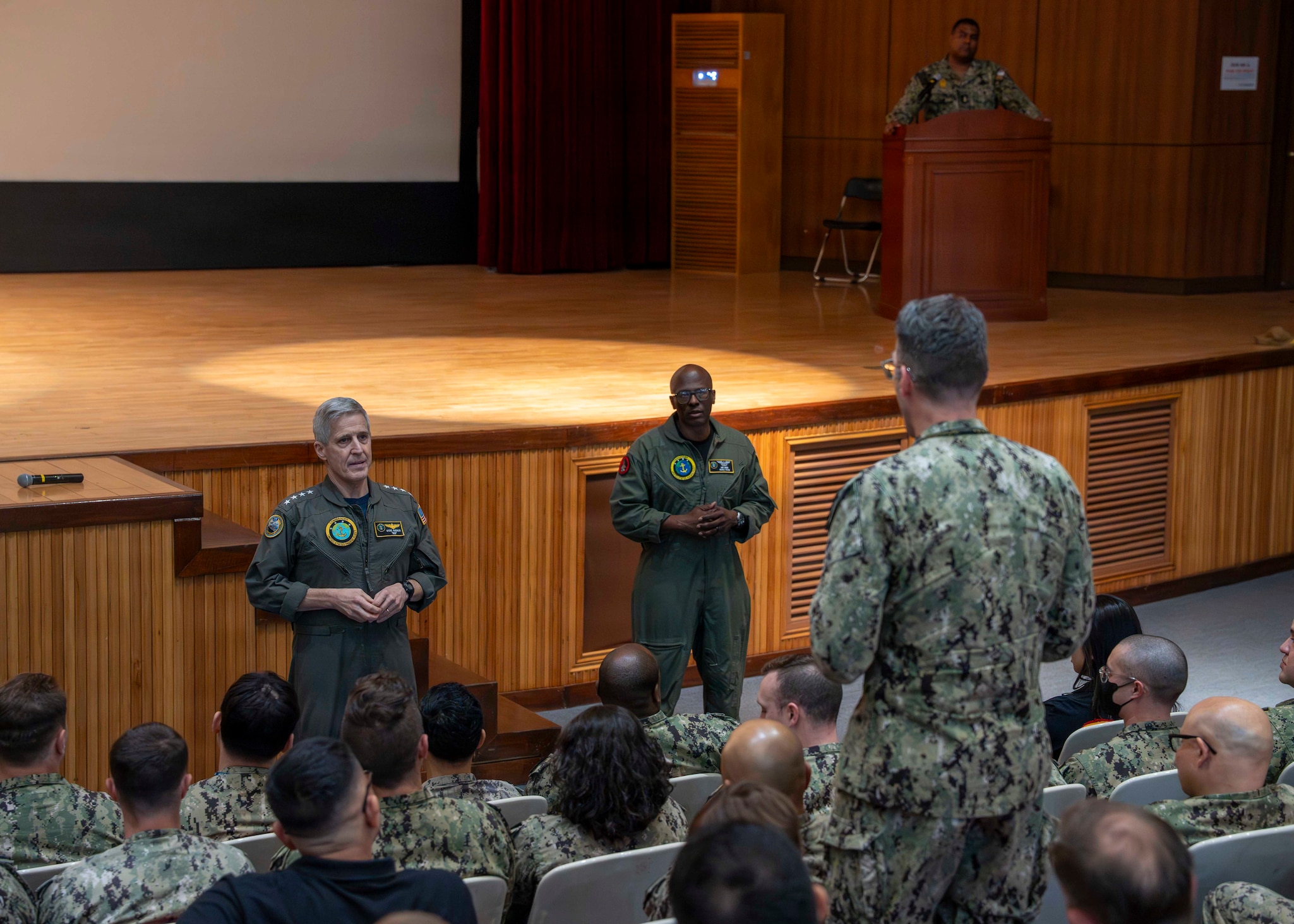 Adm. Steve Koehler, commander, U.S. Pacific Fleet, left, and U.S. Pacific Fleet Master Chief Don Davis, center, answer a question from a Sailor during an all-hands call at the Commander, U.S. Naval Forces Korea headquarters on Jakjeon Naval Base in Busan, Republic of Korea, April 16, 2026. The visit to the Republic of Korea reaffirmed the U.S.- ROK alliance as a linchpin of peace, security, and prosperity, built on decades of shared values, mutual respect, and a commitment to a free and open Indo-Pacific. (U.S. Navy photo by Mass Communication Specialist 2nd Class Christopher Sypert)