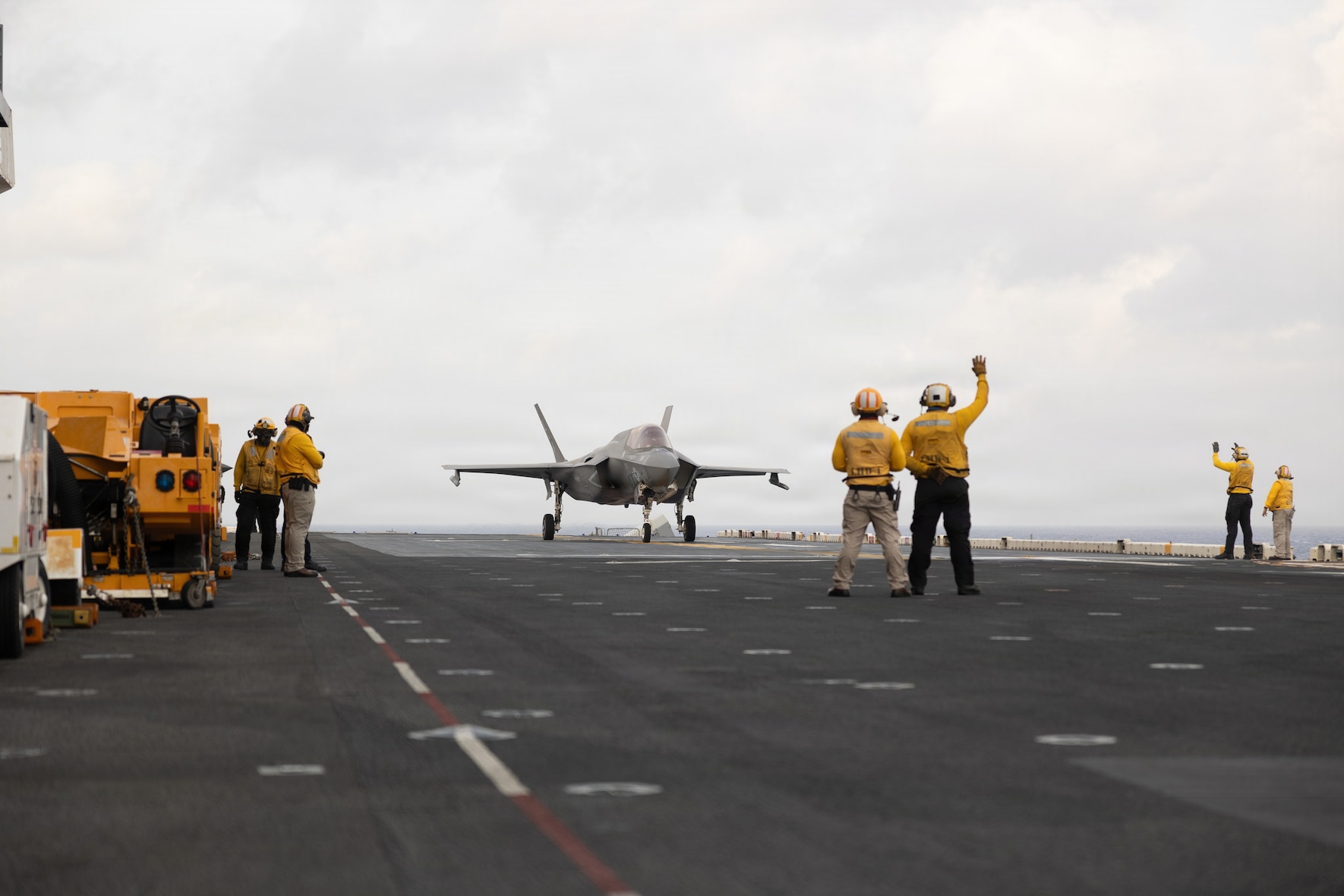 U.S. Sailors, assigned to Wasp-class amphibious assault ship USS Boxer (LHD 4), guide a U.S. Marine Corps F-35B Lightning II, assigned to Marine Fighter Attack Squadron (VMFA) 122, 11th Marine Expeditionary Unit, during flight operations in the Pacific Ocean, April 17, 2026. The 11th MEU, embarked aboard the Boxer Amphibious Ready Group, is a persistent, combat credible force contributing to deterrence and crisis response in the U.S. 7th Fleet area of operations. U.S. 7th Fleet, the U.S. Navy's largest forward-deployed numbered fleet, routinely interacts and operates with allies and partners to preserve a free and open Indo-Pacific. (U.S. Marine Corps photo by Lance Cpl. Nicole Stuart)
