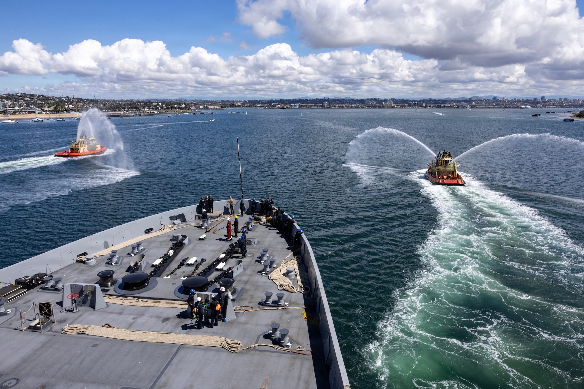 Amphibious transport dock USS John P. Murtha (LPD 26) transits the San Diego harbor to Naval Base San Diego, April 11, 2026. John P. Murtha is underway in the U.S. 3rd Fleet area of operations supporting NASA’s Artemis II mission, retrieving the crew and spacecraft following their return to Earth and splashdown in the Pacific Ocean. NASA’s Artemis II mission sent four astronauts on a flight around the moon in the Orion space capsule, marking the first time humans journeyed to deep space in over 50 years. (U.S. Navy photo by Mass Communication Specialist 1st Class Charles J. Scudella III)
