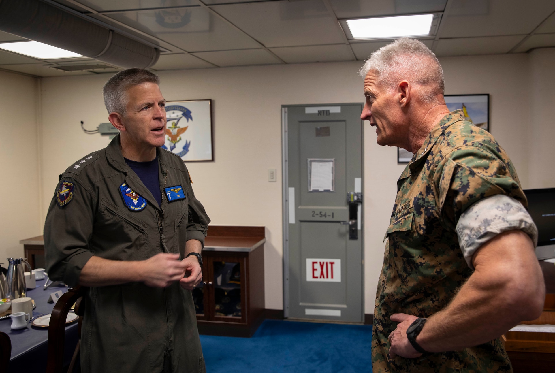 U.S. 7th Fleet Commander Vice Adm. Pat Hannifin, left, meets with U.S. Marine Corps Lt. Gen. Roger B. Turner, commanding general, III Marine Expeditionary Force, aboard U.S. 7th Fleet flagship USS Blue Ridge during a scheduled port visit in Okinawa, Japan, April 20, 2026. U.S. 7th Fleet, the Navy's largest forward-deployed numbered fleet, routinely interacts and operates with allies and partners in preserving a free and open Indo-Pacific. (U.S. Navy Photo by Mass Communication Specialist 1st Class Caitlin Flynn)