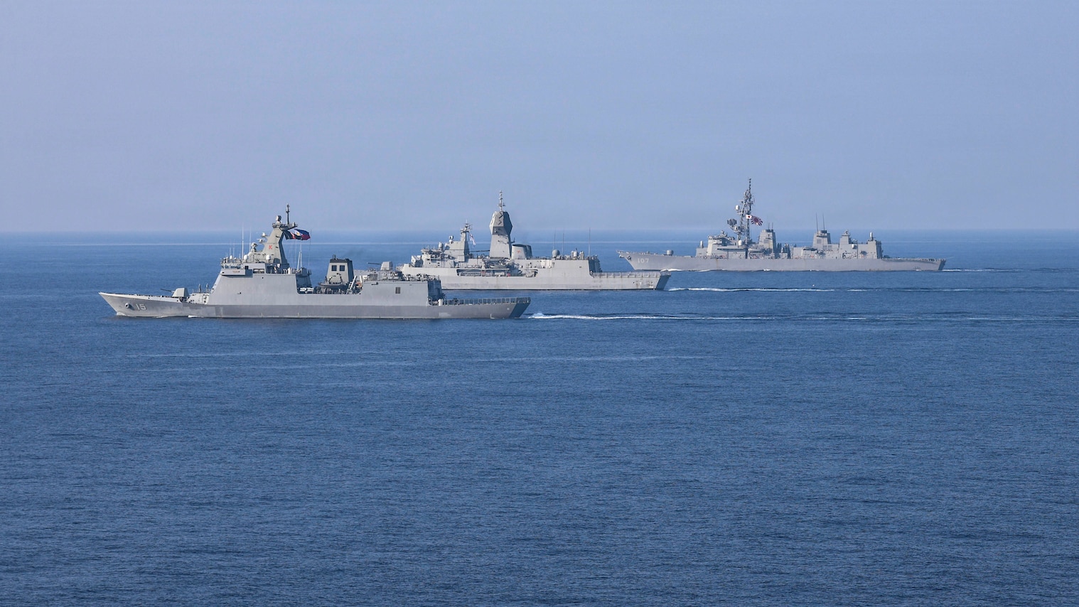 Philippine Navy Jose Rizal-class guided-missile frigate BRP Antonio Luna (FFG 15), front, Royal Australian Navy, Anzac-class frigate HMAS Toowoomba (FFH 156), and Japan Maritime Self-Defense Force, Murasame-class destroyer JS Ikazuchi (DD 107), cruise in formation with ships from the Armed Forces of the Philippines, JMSDF, RAN, Royal Canadian Navy, U.S. Coast Guard, and U.S. Navy during the group sail exercise for Exercise Balikatan 2026. Balikatan is a longstanding annual exercise between the Armed Forces of the Philippines and U.S. military that represents the strength of our alliance, improves our capable combined force, and demonstrates our commitment to regional peace and prosperity. (U.S. Navy photo by Mass Communication Specialist 1st Class John B. Hetherington)